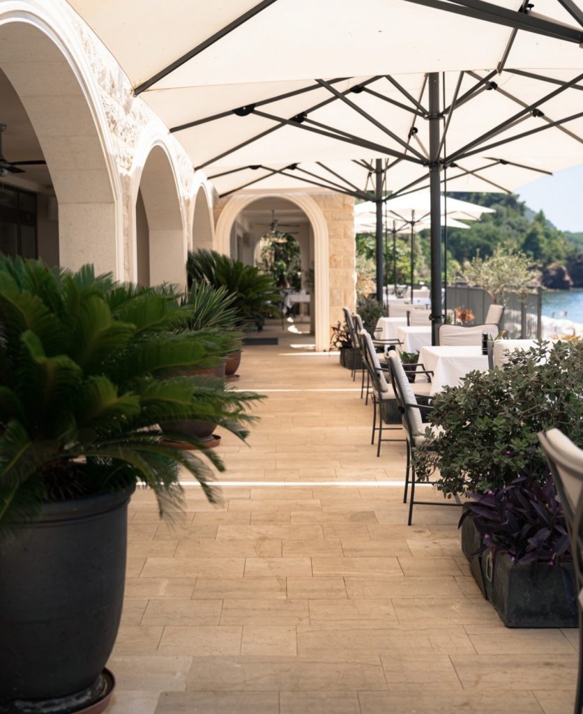 Guests dine on an elegant seaside terrace where the gentle sound of waves accompanies each course. Whether enjoying grilled fish, handmade pasta, or a glass of Montenegrin wine, the experience is both relaxed and refined, an invitation to savor the coastal lifestyle.